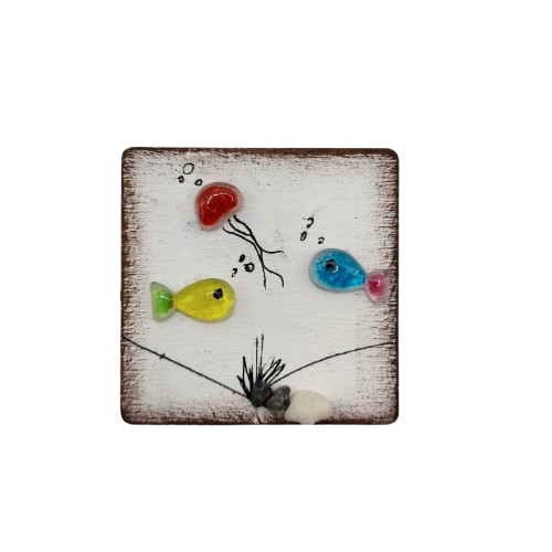 Χειροποίητο ξύλινο μαγνητάκι, σε μέγεθος 6x6cm με σχέδιο ψαράκια στο βυθό από γυαλί με τη μέθοδο fusing σε διάφορα χρώματα και ζωγραφική.