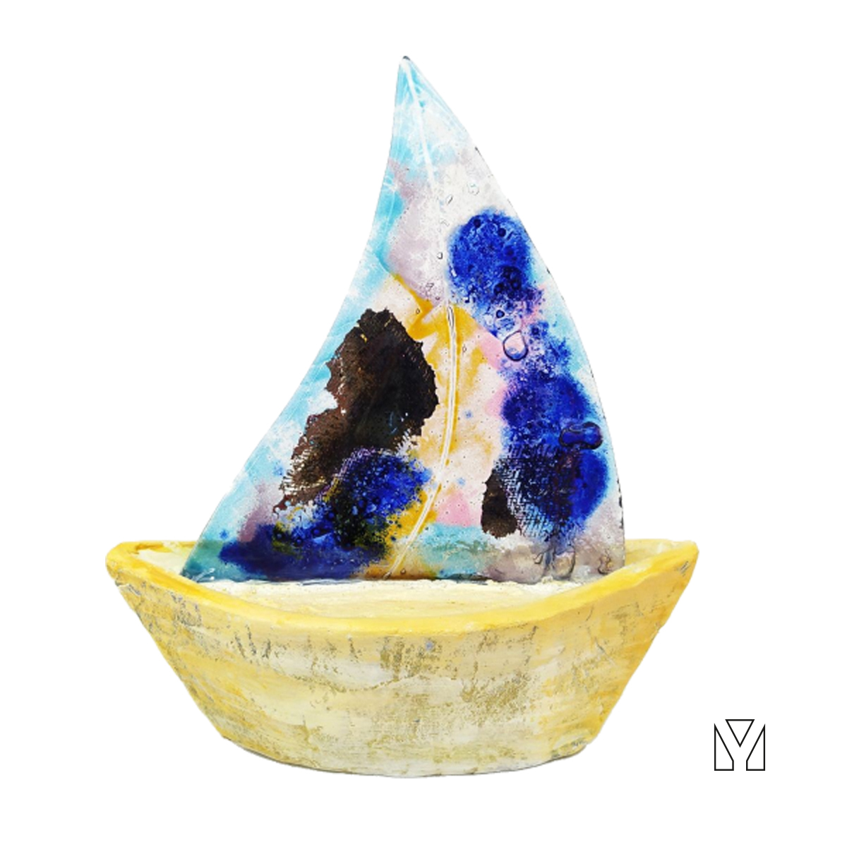 Χειροποίητη κατασκευή σε σχήμα μεγάλο καράβι από χαρτοπολτό και γυαλί με τη μέθοδο fusing σε διάφορα χρώματα.