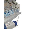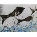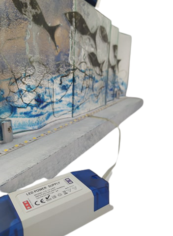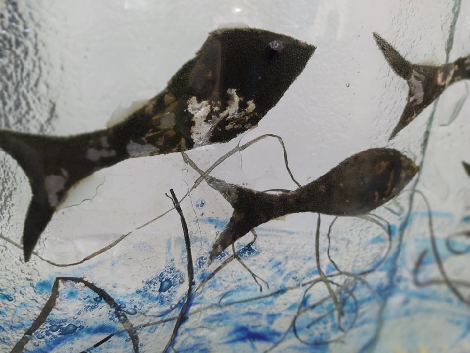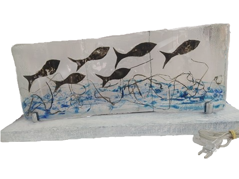Χειροποίητη κατασκευή επιτραπέζιο φωτιστικό από γυαλί με τη μέθοδο fusing, διακοσμημένο με ψάρια, πάνω σε ξύλο.