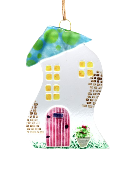 Χειροποίητη γυάλινη κατασκευή τοίχου, με σχέδιο σπίτι με τη μέθοδο fusing σε διάφορα σχέδια και χρώματα.