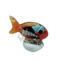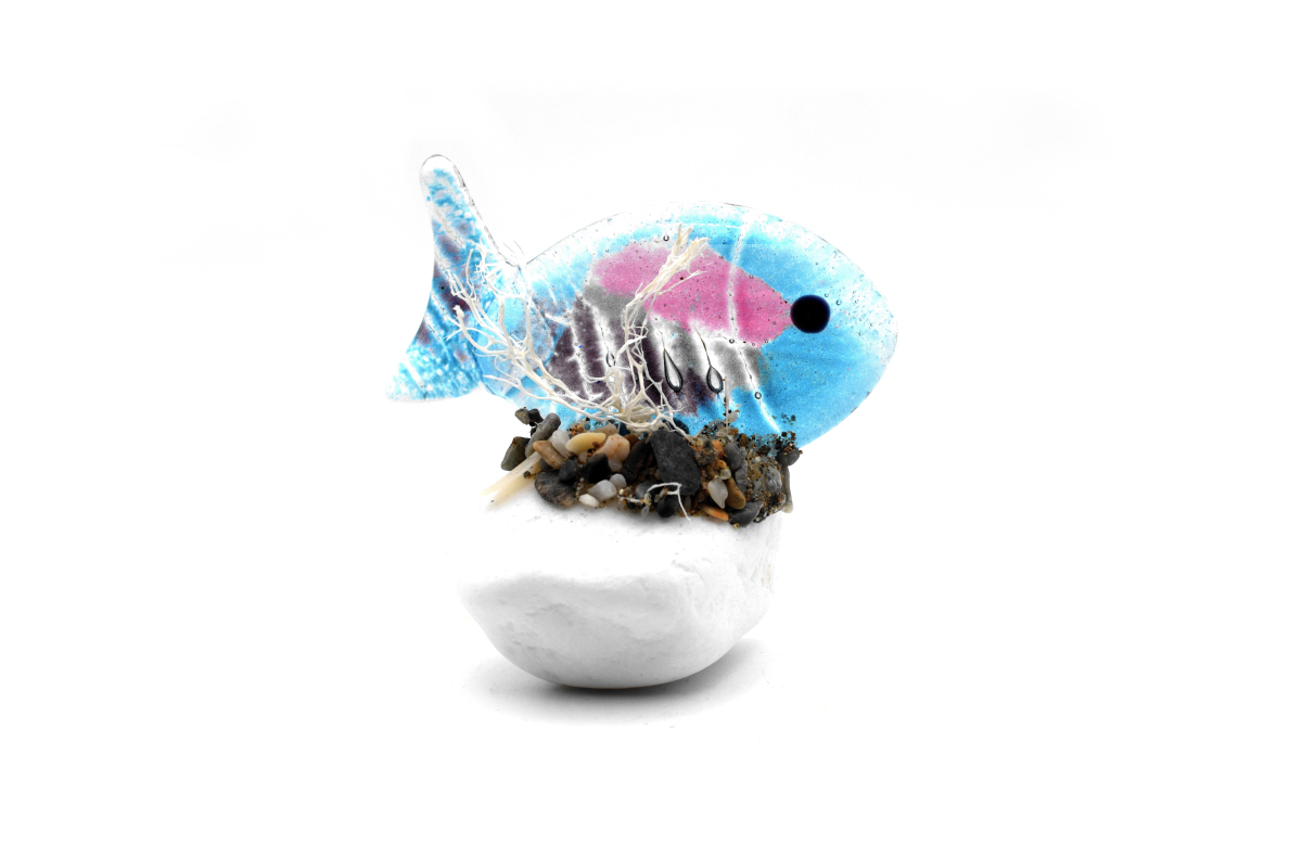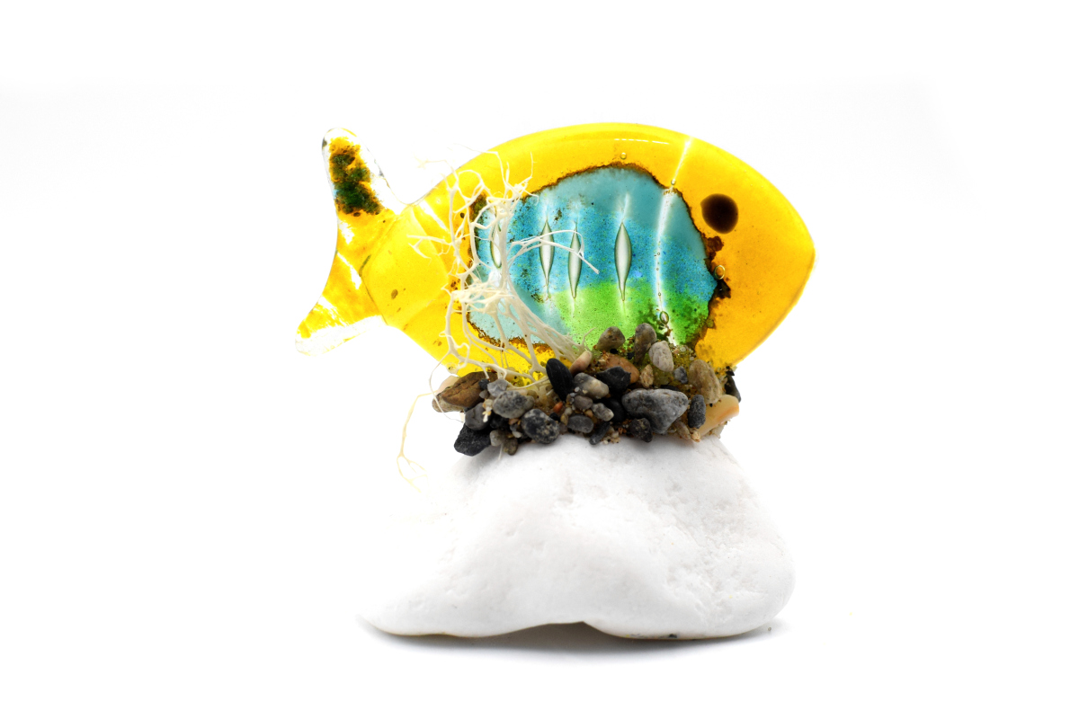 Χειροποίητη κατασκευή γυάλινο μικρό ψαράκι, με τη μέθοδο fusing, πάνω σε λευκό βότσαλο θαλάσσης.