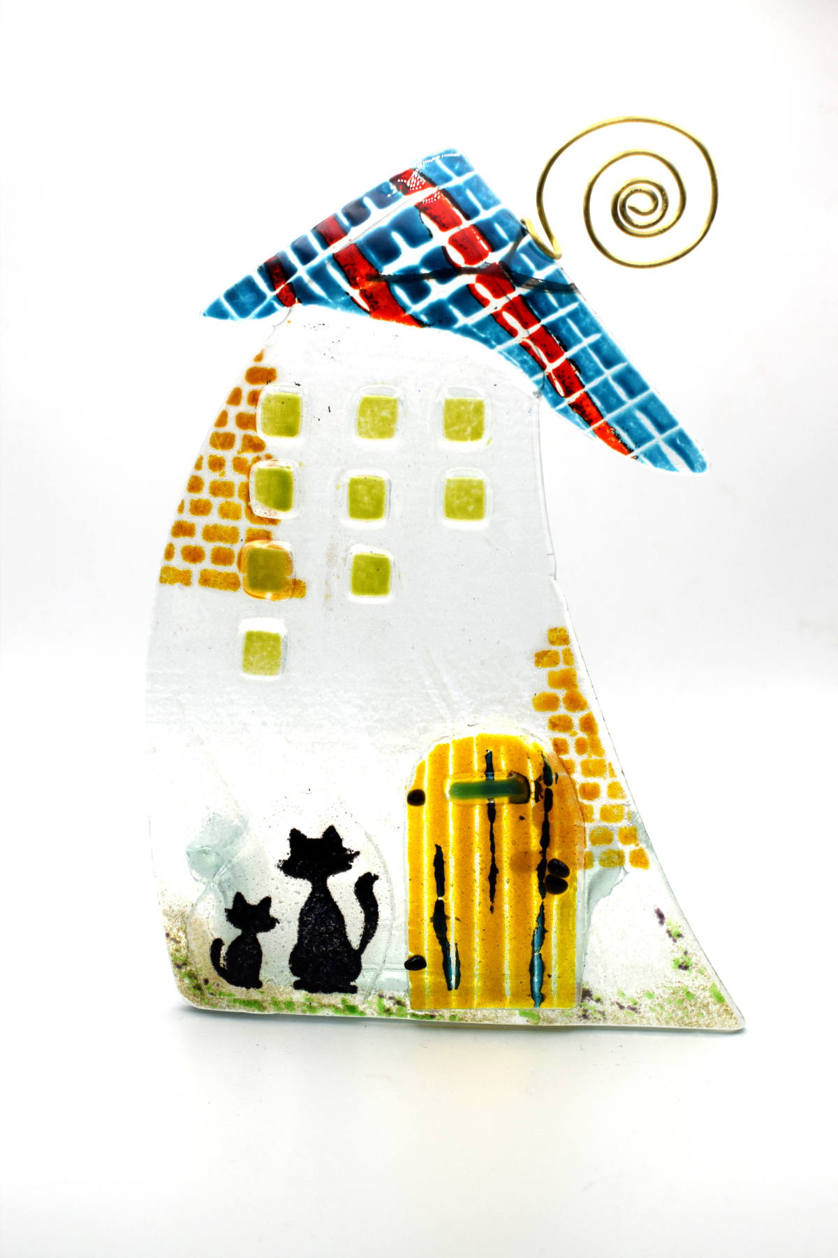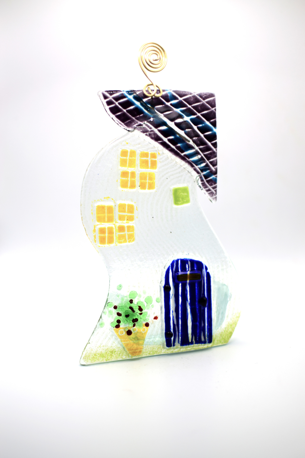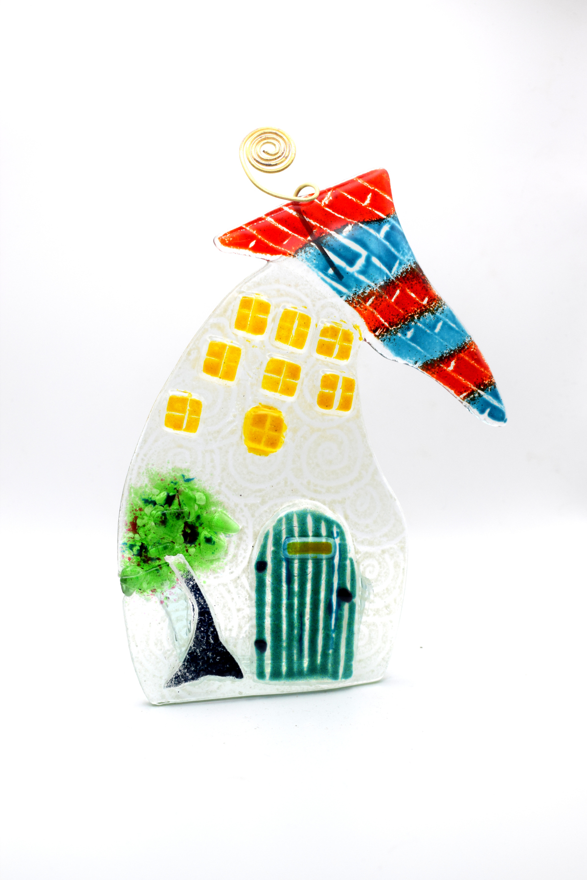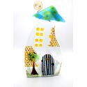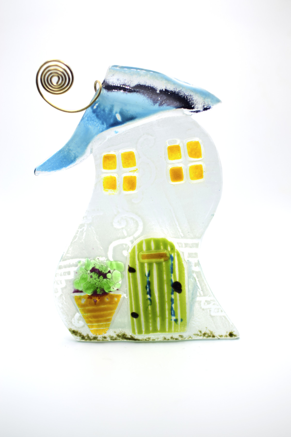 Χειροποίητη γυάλινη κατασκευή σε σχέδιο σπίτι μικρό για ρεσό, με τη μέθοδο fusing, ιδανικό για τη διακόσμηση του σπιτιού ή του επαγγελματικού σας χώρου. Διατίθεται σε διάφορα σχέδια και χρώματα.