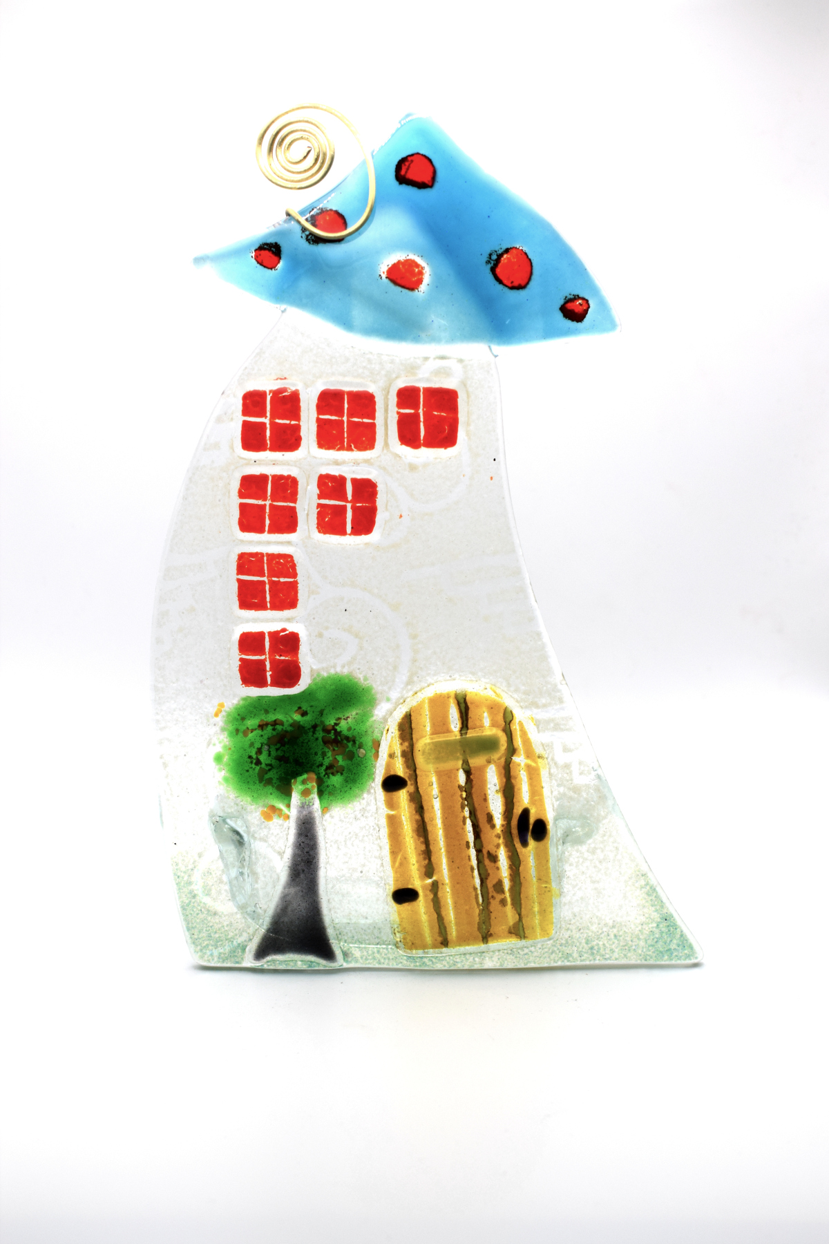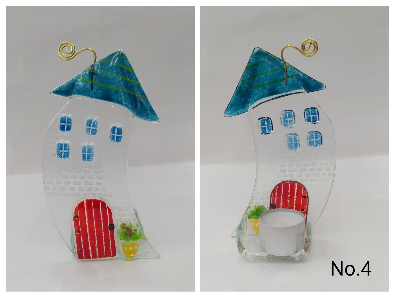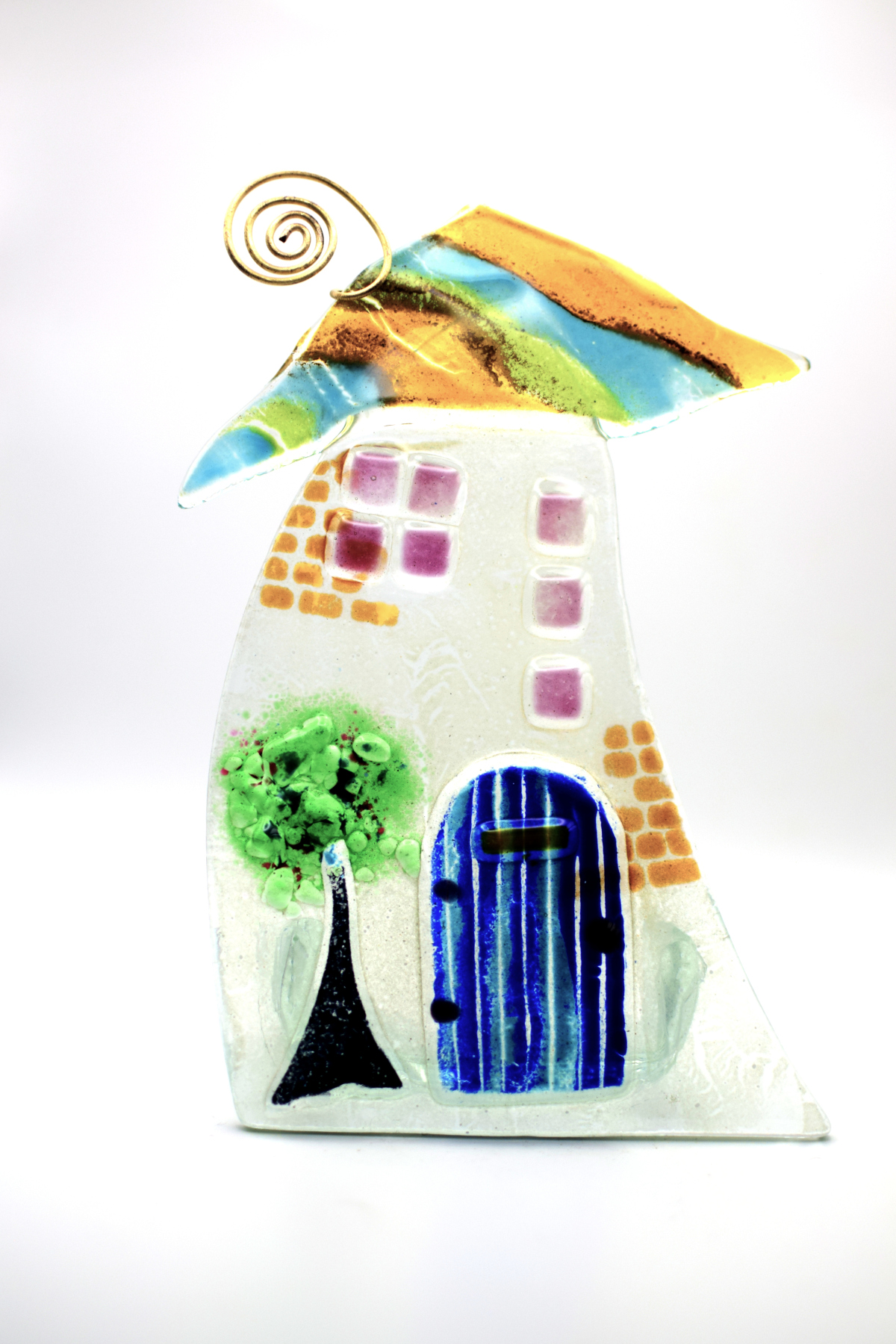 Χειροποίητη γυάλινη κατασκευή σε σχέδιο σπίτι μικρό για ρεσό, με τη μέθοδο fusing, ιδανικό για τη διακόσμηση του σπιτιού ή του επαγγελματικού σας χώρου. Διατίθεται σε διάφορα σχέδια και χρώματα.