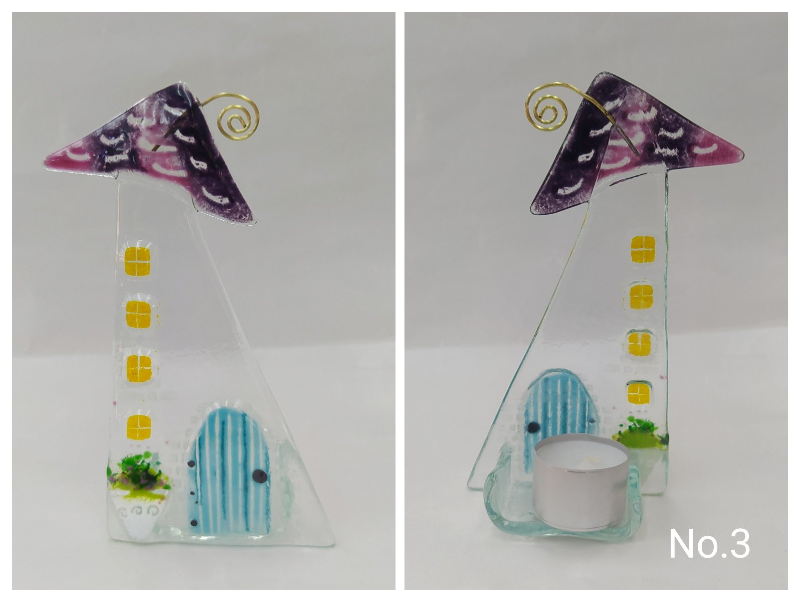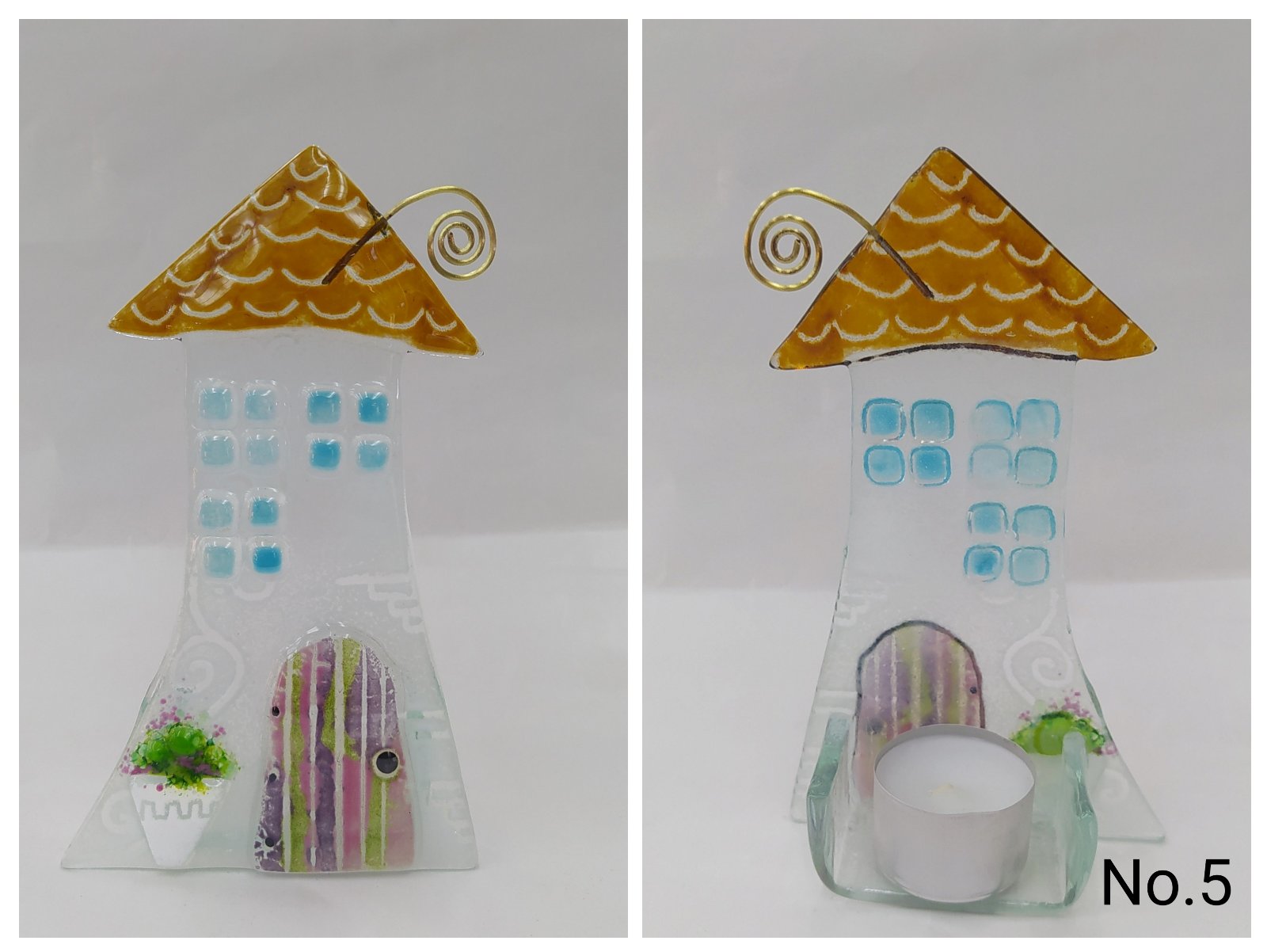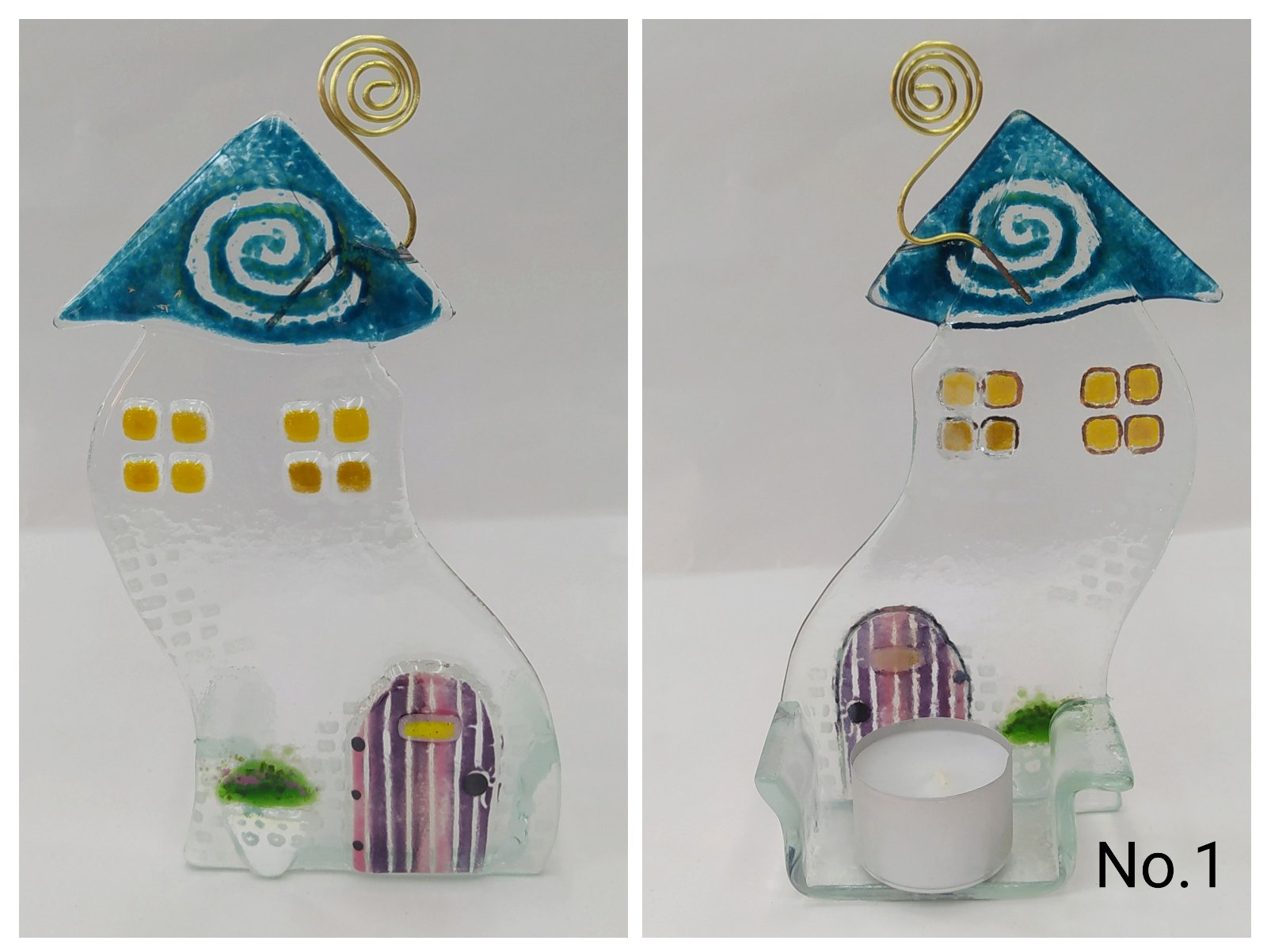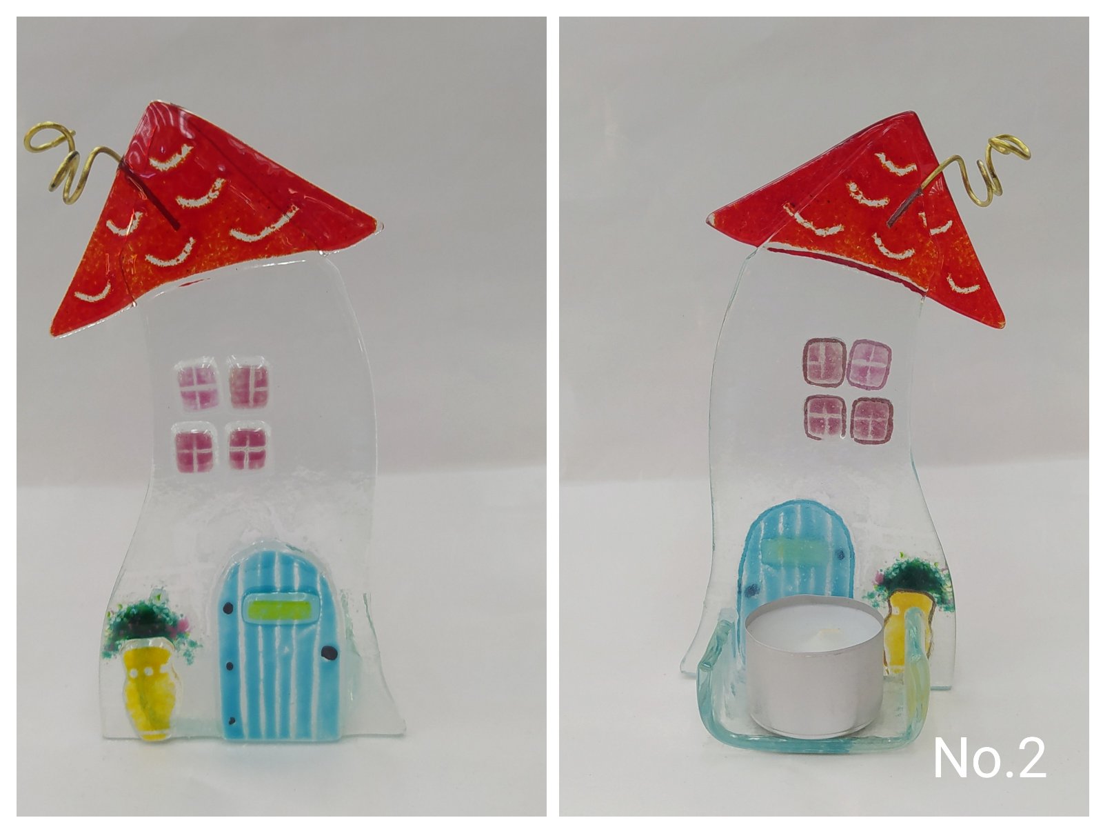 Χειροποίητη γυάλινη κατασκευή σε σχέδιο σπίτι μικρό για ρεσό, με τη μέθοδο fusing, ιδανικό για τη διακόσμηση του σπιτιού ή του επαγγελματικού σας χώρου. Διατίθεται σε διάφορα σχέδια και χρώματα.