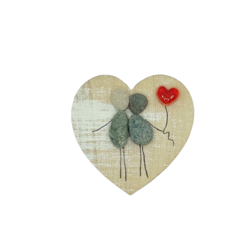 Χειροποίητο ξύλινο μαγνητάκι σε σχήμα καρδιά , με σχέδιο ζευγάρι με καρδιά, με φυσική πέτρα θαλάσσης και γυαλί.