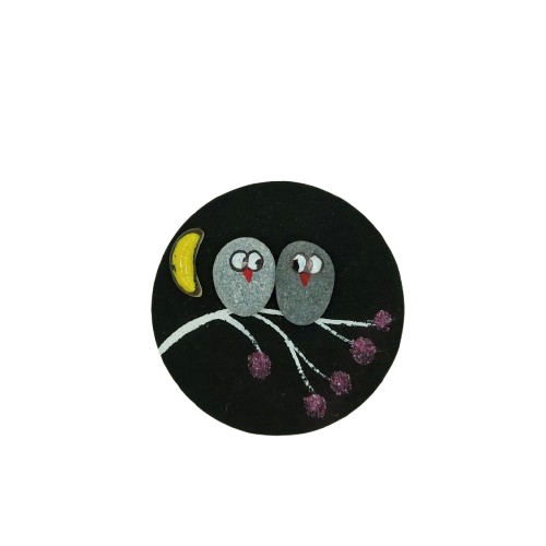Χειροποίητο ξύλινο μαγνητάκι σε μέγεθος στρογγυλό φ65, με σχέδιο κουκουβάγιες σε κλαδί, με φυσική πέτρα θαλάσσης, γυαλί και χρωματιστή άμμος.
