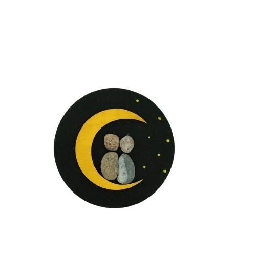 Χειροποίητο ξύλινο μαγνητάκι σε μέγεθος στρογγυλό φ65, με σχέδιο ζευγάρι πάνω σε φεγγάρι, με φυσική πέτρα θαλάσσης και χαρτόνι.