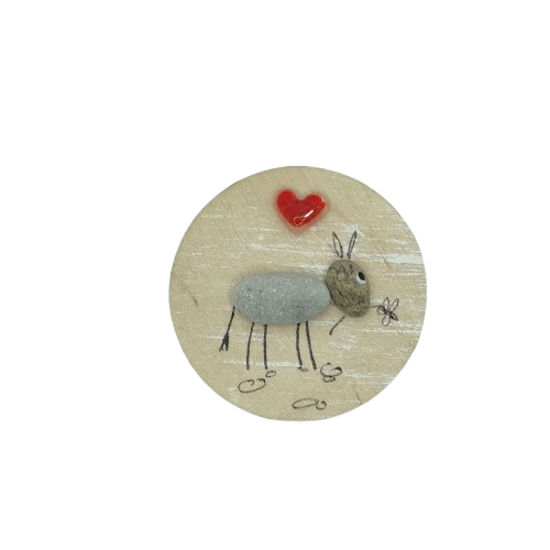 Χειροποίητο ξύλινο μαγνητάκι σε μέγεθος στρογγυλό φ65, με σχέδιο γάιδαρος με καρδιά, με φυσική πέτρα θαλάσσης και γυαλί.