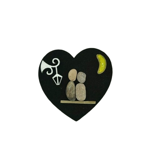 Χειροποίητο ξύλινο μαγνητάκι σε σχήμα καρδιά , με σχέδιο ζευγάρι σε παγκάκι κάτω από φανάρι, με φυσική πέτρα θαλάσση, γυαλί και χαρτόνι.