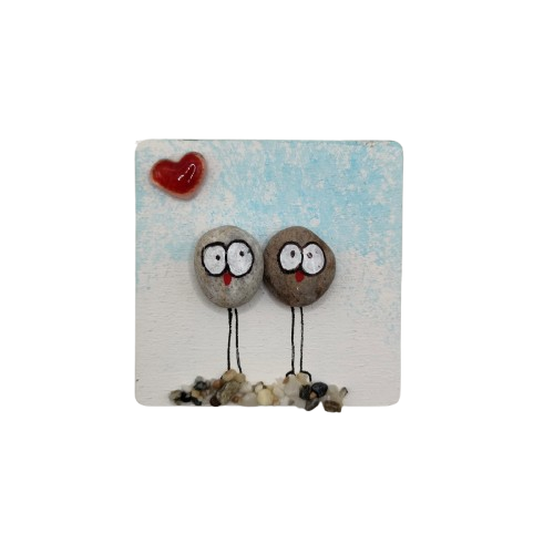 Χειροποίητο ξύλινο μαγνητάκι σε μέγεθος 6x6, με σχέδιο πουλιά, με φυσική πέτρα θαλάσσης και γυαλί.