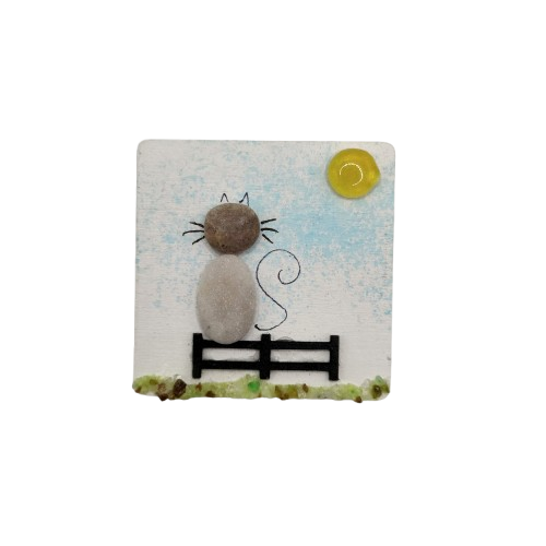 Χειροποίητο ξύλινο μαγνητάκι σε μέγεθος 6x6, με σχέδιο γάτα, με φυσική πέτρα θαλάσσης, χαρτόνι και γυαλί.