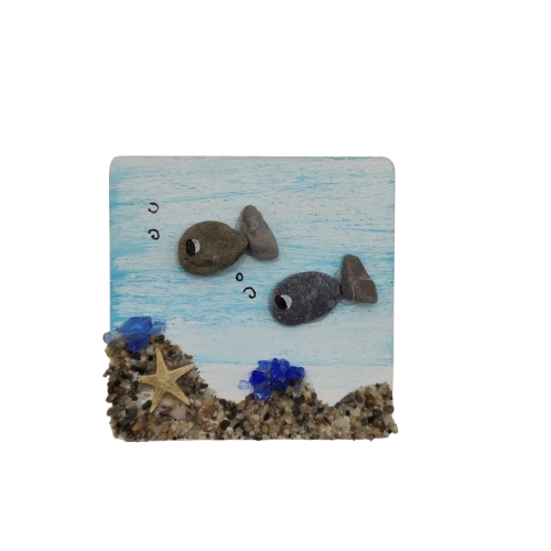 Χειροποίητο ξύλινο μαγνητάκι σε μέγεθος 6x6, με σχέδιο ψάρι, με φυσική πέτρα θαλάσσης και γυαλί.