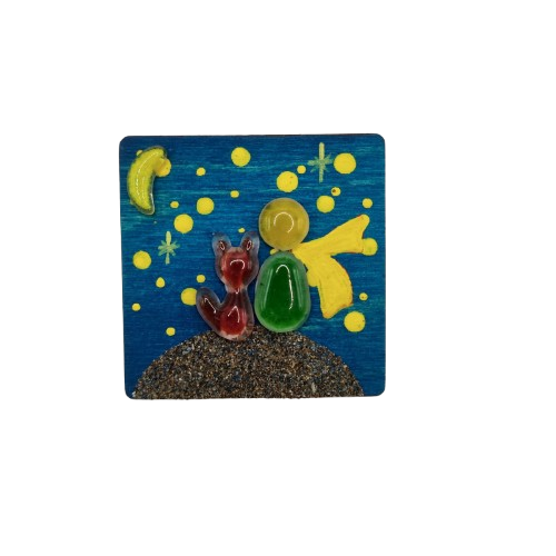 Χειροποίητο ξύλινο μαγνητάκι, σε μέγεθος 6x6cm με σχέδιο μικρός πρίγκιπας από γυαλί με τη μέθοδο fusing και ζωγραφική.