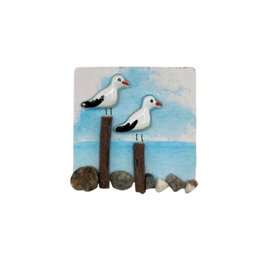 Χειροποίητο μαγνητάκι γλάροι σε ξύλο, με γυαλί με τη μέθοδο fusing, σε διάσταση 6x6cm.