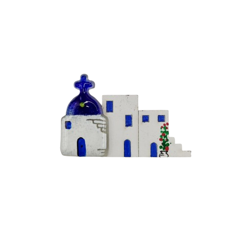 Χειροποίητο μαγνητάκι εκκλησία στις κυκλάδες, με γυαλί με τη μέθοδο fusing.