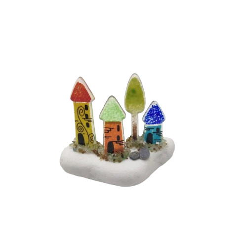 Χειροποίητη κατασκευή πολύχρωμο χωριό, με τη μέθοδο fusing, πάνω σε λευκό βότσαλο.