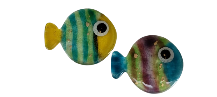 Γυάλινο στρογγυλό σε σχήμα ψάρι, με τη μέθοδο fusing, σε μέγεθος 11.5 x 9.3 cm.